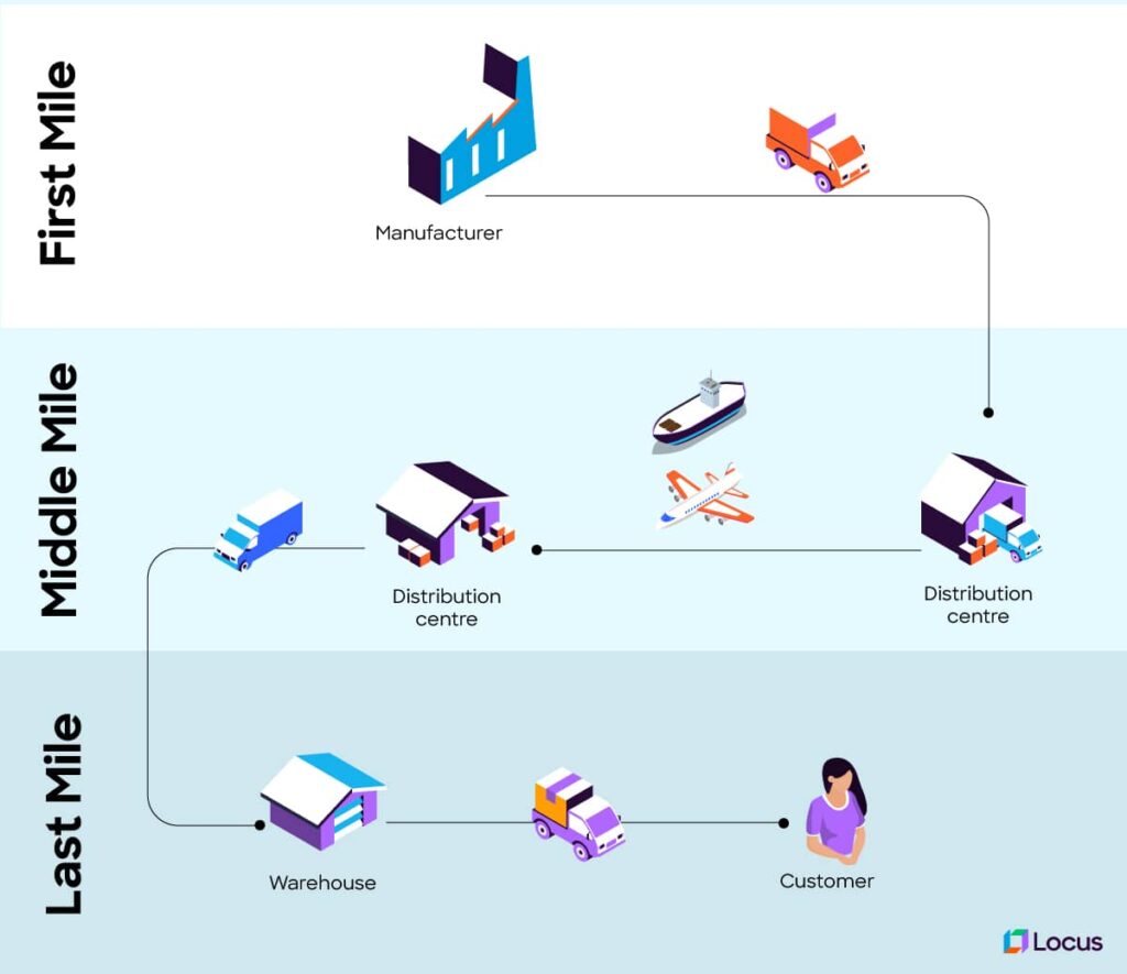 - Middle mile: Transfer from the distribution center to a local facility or retail outlet.